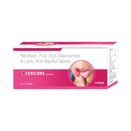 | DESCRIPTION: | Olercare tablets contain Riboflavin (Vitamin B2), Niacinamide (Vitamin B3), Folic acid (Vitamin B9) with Lactic acid bacillus. Orafast is indicated for Stomatitis, Cheilosis, Glossitis and Pellagra. |