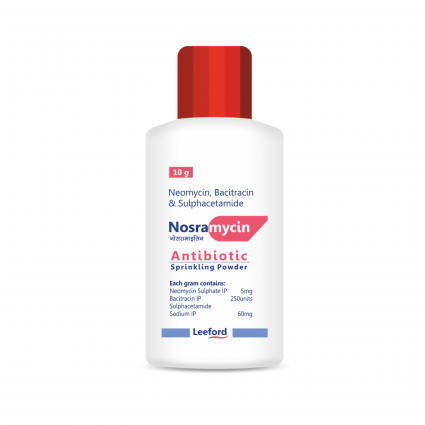 | DESCRIPTION: | Nosramycin powder contains Neomycin, Bacitracin & Sulphacetamide, combinations of antibiotic to provide effective eradication of disease causing bacteria from skin infections. It is prescribed for wound infections, burns, corroded skin, gangrene and in dusting of wounds after ear and nose surgery. |