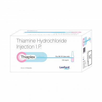 | DESCRIPTION: | Thiaplex Inj. contains Thiamine Hydrochloride, a water soluble form of Vitamin B1 for IM or IV (Infusion or slow direct injection) use. Thiamine hydrochloride injection is used for thiamine deficiency or beriberi, Wernicke's encephalopathy, infantile beriberi with acute collapse, cardiovascular disease due to thiamine deficiency & neuritis of pregnancy if vomiting is severe. Thiaplex is also indicated when giving IV dextrose to individuals with marginal thiamine status to avoid precipitation of heart failure. |