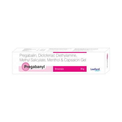 | DESCRIPTION: | Pregabanyl gel is a combination of Pregabalin a centrally acting analgesic, Diclofenac a NSAID, Methyl Salicylate a rubefacient and analgesic, Menthol which acts as a counter irritant & Capsaicin which acts as an anti-inflammatory agent. This combination is specially formulated to provide relief in neuropathic pain. |
