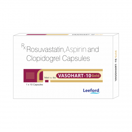 | DESCRIPTION: | Vasohart-Gold capsules contains Rosuvastatin that lowers the fat levels (lipids) in blood; Clopidogrel & Aspirin, which are blood thinner, that reduces the risk of blood coagulation. It is prescribed after stenting and to reduce the risk of heart, brain & blood vessels diseases in diabetics & other high risk individuals. |