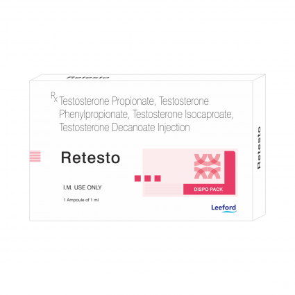 | DESCRIPTION: | Retesto injection contains four types of Testosterone hormones.They mimic the activity of the natural Testosterone to deliver desired results. It should be used as Testosterone replacement in primary and secondary male hypogonadism.(Diminished functional activity of the gonads). Retesto is also used to treat the symptoms of impotence and delayed puberty in males. |