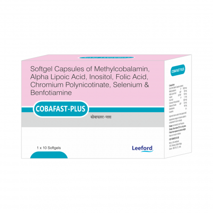 | DESCRIPTION: | Cobafast-Plus softgel contains Methylcobalamin (bioactive form of Vitamin B12), Alpha Lipoic Acid (a potent antioxidant), Inositol (a sugar-like compound for nerve function), Folic Acid (Vitamin B9), Chromium polynicotinate (for glucose metabolism), Selenium dioxide (an antioxidant mineral), and Benfotiamine (lipid-soluble Vitamin B1 derivative). This combination synergistically supports nerve health, manages symptoms of diabetic and peripheral neuropathy, and aids in blood sugar control. |