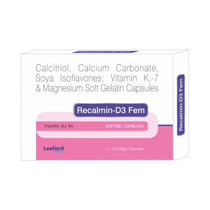 | DESCRIPTION: | Recalmin-D3 Fem softgels contain Calcitriol (A bioactive form of Vitamin D3), Calcium and Soyaisoflovones, for healthy bones in females, Vitamin K2 7 and Magnesium for overall bone health. Recalmin-D3 fem softgels are formulated specially for women and are indicated in treatment of post-menopausal Osteoporosis and to reduce the risk of Osteoporosis. |