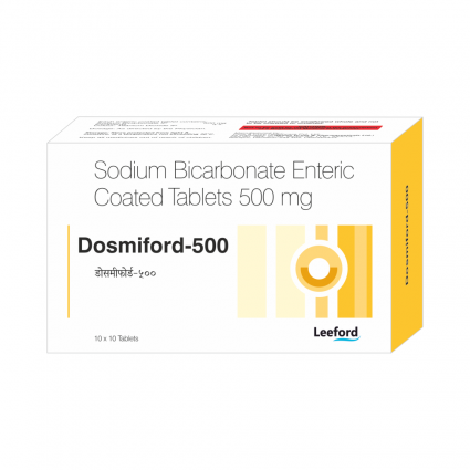 | DESCRIPTION: | Dosmiford-500 contains Sodium Bicarbonate, an alkalizer which acts as a buffer against metabolic acidosis in renal failure patients or acute kidney injury patients & acts by raising decreased blood pH to normalize it. |