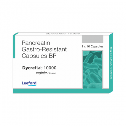 | DESCRIPTION: | Dycreflat-10000 capsule contains Pancreatin, a Pancreatic enzyme lipases, proteases & amylases which helps in digestion of fats, proteins and carbohydrates which is particularly useful in re-establishing natural digestive conditions. It is used in Acute and chronic pancreatitis, Pancreatectomy & pancreatic exocrine insufficiency. |