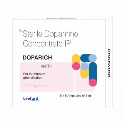 | DESCRIPTION: | Doparich contains Dopamine, a sympathomimetic vasopressor & is the naturally occurring immediate precursor of Norepinephrine in noradrenergic nerves and is also a neurotransmitter in certain areas of the central nervous system. Dopamine in Doparich injection increases heart rate, cardiac contractility & thus increases blood pressure. |