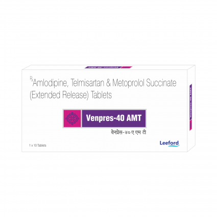 | DESCRIPTION: | Venpres-40 AMT tablets is a combination medicine used to manage high blood pressure and reduce the risk of heart-related complications. Venpres-40 AMT tablets contains Amlodipine, Telmisartan and Metoprolol. Amlodipine is a calcium channel blocker that relaxes blood vessels, Telmisartan is an angiotensin receptor blocker that helps lower blood pressure, and Metoprolol is a beta-blocker that reduces heart rate. Together, they improve heart health and help maintain stable blood pressure levels. |