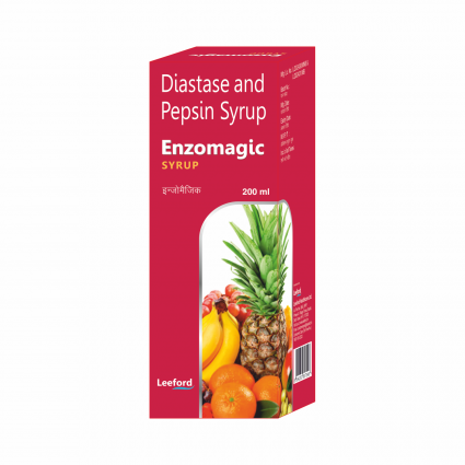 | DESCRIPTION: | Enzomagic Syrup contains Fungal diastase which is a potent enzyme complex, used as effective digestive aid, and digests (or breakdown) carbohydrates & Pepsin helps in protein digestion by breaking larger molecules into smaller one. Etazyme syrup is used for the treatment of indigestion, flatulence, hyperacidity, bloating, stomach cramps and various other types of digestion related problems. It also increases appetite of body and maintains the metabolic activities of body. |