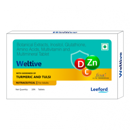 DESCRIPTION: | Weltive tablets is a potent nutraceutical supplement combination which contains Botanical extracts, Inositol, Glutathione, Amino Acids, Multivitamins and Multiminerals which supports overall health and well-being. Botanical extracts provide antioxidant and anti-inflammatory benefits, while inositol supports cellular function. Glutathione aids detoxification, and amino acids contribute to muscle repair and growth. The multivitamins and multiminerals enhance energy, immune function, and metabolic processes, promoting balanced nutrition and vitality. |