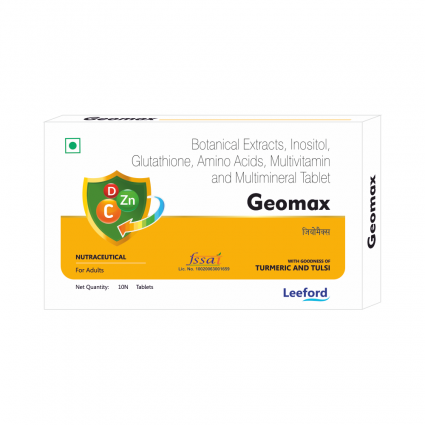 Geomax tablets is a potent nutraceutical supplement combination which contains Botanical extracts, Inositol, Glutathione, Amino Acids, Multivitamins and Multiminerals which supports overall health and well-being. Botanical extracts provide antioxidant and anti-inflammatory benefits, while inositol supports cellular function. Glutathione aids detoxification, and amino acids contribute to muscle repair and growth. The multivitamins and multiminerals enhance energy, immune function, and metabolic processes, promoting balanced nutrition and vitality. |