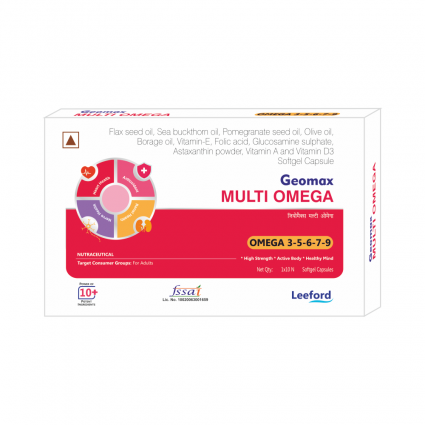 | COMPOSITION: | Each softgel contains Flax seed oil 150 mg (Omega 3,6,9), Fish oil 250 mg (EPA 90 mg & DHA 60 mg), Methyltetrahydrofolic acid 200 mcg, Vit.E 7.5 mg, Lycopene 10% 4000 mcg, Sea Buckthorn oil 200 mcg, Borage oil 50 mg, Vit. D3 300 mcg, Vit.A 200 IU, Olive oil 87 mg & Pomegranate seed oil 100 mg |