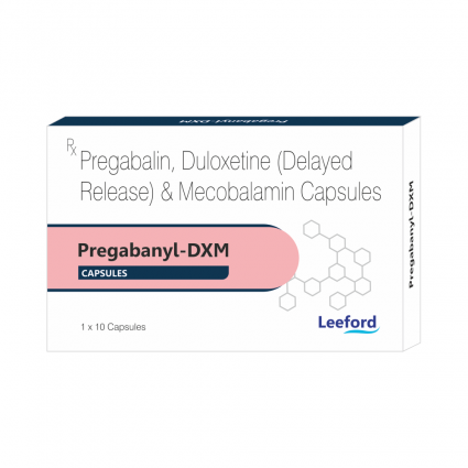 | DESCRIPTION: | Pregabanyl-DXM is a triple combination capsule containing Pregabalin, which reduces nerve pain by modulating calcium channels; Duloxetine, a serotonin-norepinephrine reuptake inhibitor (SNRI) effective in managing chronic pain and depression; and Mecobalamin, a neurotropic vitamin that supports nerve regeneration. This combination is prescribed for the treatment of diabetic neuropathy, fibromyalgia, and other chronic neuropathic pain conditions. |