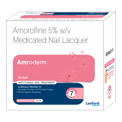 | DESCRIPTION: | Amroderm Nail Lacquer is a topical antifungal formulation containing Amorolfine Hydrochloride 5% w/v, a broad-spectrum antifungal agent effective against dermatophytes, yeasts, and molds. It penetrates the nail plate and acts directly at the site of infection, making it ideal for the treatment of onychomycosis (fungal infections of the nails). The lacquer forms a protective film over the nail, allowing sustained drug release and deep penetration for enhanced efficacy. |