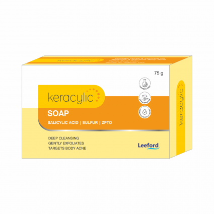 | DESCRIPTION: | Keracylic Soap is a medicated bar for oily skin, acne, dandruff, and seborrheic dermatitis. It contains Salicylic Acid for exfoliation, Sulfur for antimicrobial action, and ZPTO to control fungal growth. Ideal for acne-prone skin and scalp conditions. |