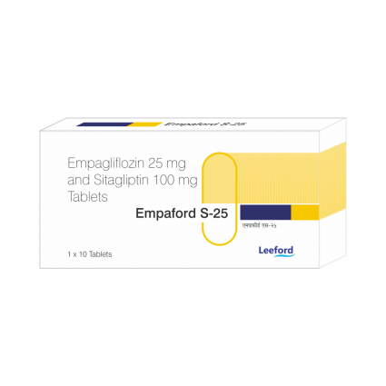 | DESCRIPTION: | Empaford S- 25 tablets contain Empagliflozin and Sitagliptin, two antidiabetic agents that help control blood sugar levels in type 2 diabetes. Empagliflozin, an SGLT2 inhibitor, lowers blood glucose by increasing its excretion through urine, while Sitagliptin, a DPP-4 inhibitor, enhances insulin secretion and reduces glucagon levels. Together, they improve glycemic control and help reduce the risk of diabetes-related complications. |
