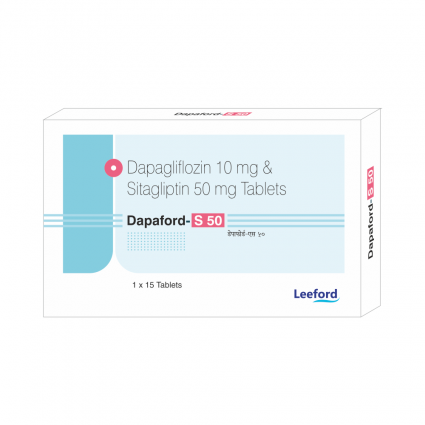 DESCRIPTION: | DAPAFORD-S 50 tablets contain Dapagliflozin, a sodium-glucose co-transporter 2 (SGLT2) inhibitor, and Sitagliptin, a dipeptidyl peptidase-4 (DPP-4) inhibitor. This combination helps lower blood sugar levels in patients with type 2 diabetes by increasing glucose excretion through urine and enhancing insulin secretion. It is prescribed to improve glycemic control along with diet and exercise. |