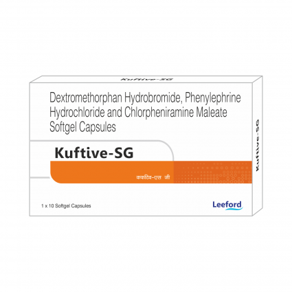 | DESCRIPTION: | Kuftive-SG contains a combination of three medicines namely Chlorpheniramine (Anti-allergic), Dextromethorphan (Anti-tussive) and Phenylephrine (Decongestant). Kuftive-SG is used to treat symptoms caused by common cold, flu, allergies, hay fever or other breathing illnesses (e.g. sinusitis and bronchitis), dry cough, throat irritation, sneezing, watery eyes, runny nose and stuffed nose. |