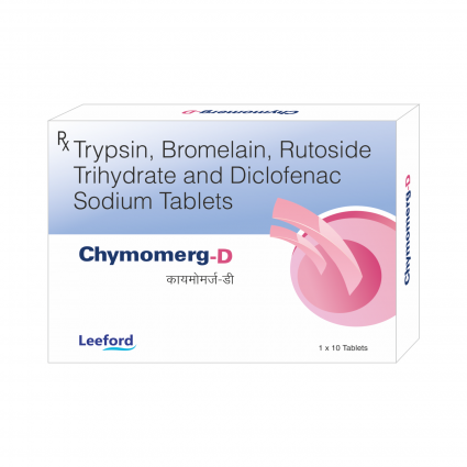 | DESCRIPTION: | Chymomerg-D Tablets contains Diclofenac, a NSAID in addition to Trypsin & Bromelain, proteolytic enzymes that clears dead cells to reduce pain and inflammation and Rutoside, a herbal analgesic for effective pain relief and is used to treat pain and inflammation related to osteoarthritis, rheumatoid arthritis, and tendonitis. It is also used to treat conditions such as edema and inflammation following surgeries of cellulitis, sports injuries, tooth extractions, and sprains. |