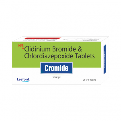| DESCRIPTION: | Cromide contains Clidinium, an anti-cholinergic that inhibits acid production in stomach and spasm in intestine and Chlordiazepoxide, an anxiolytic, sedative and appetite stimulating drug.Cromide tablets are indicated in psychological and extra-intestinal disturbances in gastrointestinal disorders. It is used with other medicines for treatment of peptic ulcers, irritable bowel syndrome (IBS) and enterocolitis. |