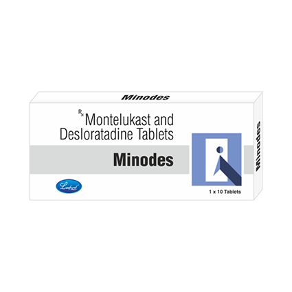 DESCRIPTION: | Minodes tablet contains Montelukast, a Leukotriene inhibitor that relieves inflammation & Desloratadine, an anti-allergic that acts by blocking the action of Histamine for its anti-allergic action. It is prescribed for long standing asthma, allergic respiratory tract congestion & for cases of seasonal & perennial allergic diseases. |