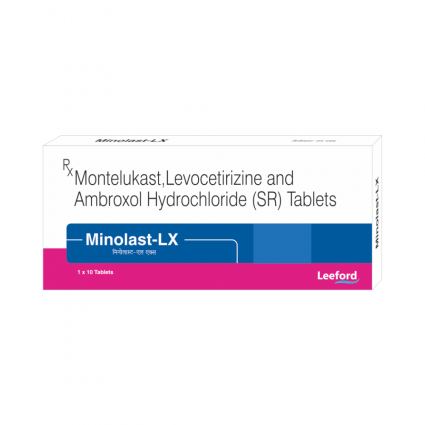 | DESCRIPTION: | Minolast-LX tablet contains Montelukast, a Leukotriene inhibitor that effectively treat inflammation & oedema associated with allergy; Levoceririzine, an anti-allergic drug & Ambroxol in sustain release form, a mucolytic drug that removes mucus from respiratory tract. It is prescribed in case of long standing asthma, chest congestion and respiratory tract congestion due to allergic mucus manifestation as well as other chronic respiratory hyper secretory allergic disorders. |