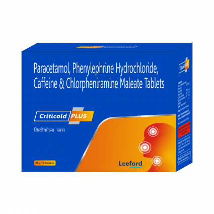 | DESCRIPTION: | Criticold Plus tablet is a combination medicine which contains Paracetamol an analgesic and antipyretic, Phenylephrine a decongestant, Chlorpheniramine a Anti-allergic and Caffeine a CNS stimulant.It is indicated for relief of nasal and sinus congestion, allergic symptoms of the nose or throat due to upper respiratory tract allergies, sinus pain and headache, adjunct with antibacterials in sinusitis, tonsillitis and otitis media. |