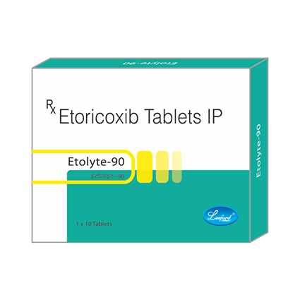 DESCRIPTION: | Etolyte 90/120 contains Etoricoxib (COX 2 inhibitor) which helps to reduce the pain and swelling (inflammation) in the joints and muscles of people 16 years of age and older with osteoarthritis, rheumatoid arthritis, ankylosing spondylitis and gout. Etolyte is also used for the short term treatment of moderate pain after dental surgery in people 16 years of age and older. |