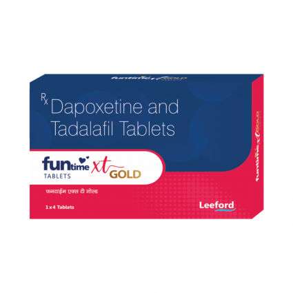 | DESCRIPTION: | Funtime-XT Gold tablet contains Tadalafil, an erectile dysfunction drug that acts by increasing blood flow into penile shaft and help it remain there for a longer duration & thus helps in retaining erection & Dapoxetine, a drug the stops premature ejaculation and increases the sexual activity duration. It is prescribed for erectile dysfunction & premature ejaculation in males. |