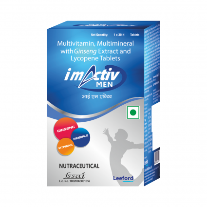IM Activ Men tablet contains all vitamins, minerals along with Lycopene & Ginseng to offer a complete solution in today?s fast paced life. IM Activ Men Enhances physical performance, supports cognitive function, helps in proper metabolism, helps regulate & maintain Immune function, provides antioxidant and nutritional support & supports active and hectic life style of modern era. |