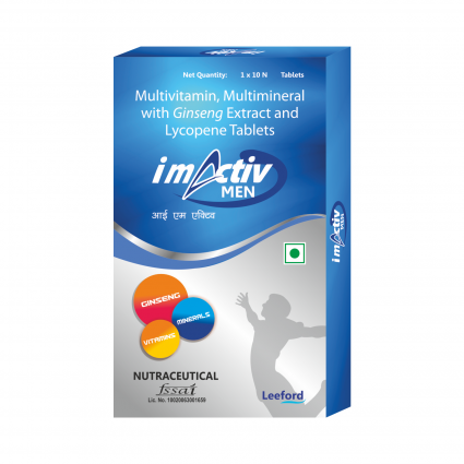DESCRIPTION: IM Activ Men tablet contains all vitamins, minerals along with Lycopene & Ginseng to offer a complete solution in today?s fast paced life. IM Activ Men Enhances physical performance, supports cognitive function, helps in proper metabolism, helps regulate & maintain Immune function, provides antioxidant and nutritional support & supports active and hectic life style of modern era.